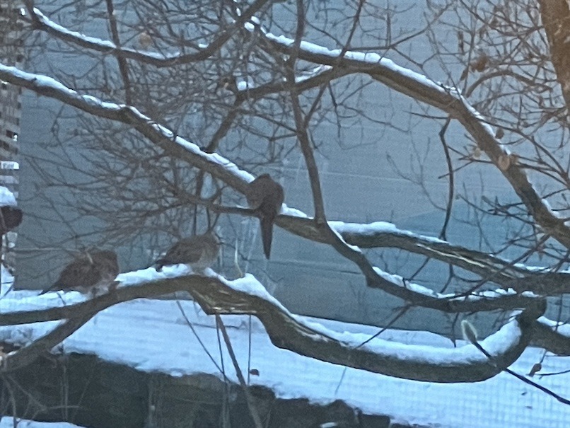 The dogwood and the serviceberry are none the worse for the wear, but the smokebushes are in a sad state; three major branches on two plants have split along their length. According to Wikipedia, mourning doves are roughly 12–14 inches long, which makes them a handy measuring guide as they sulk in the smokebushes. As a rough guesstimate, the splits are 2–3 feet long.