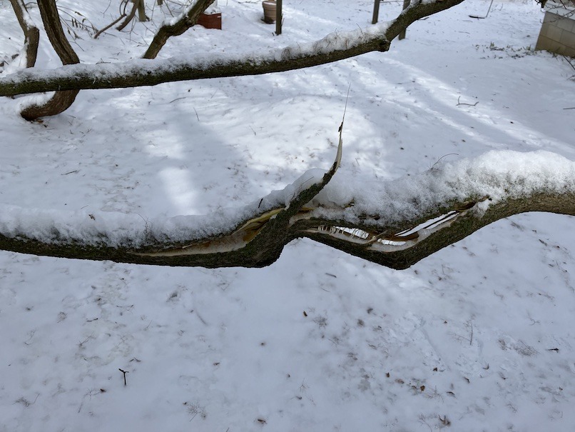 The damage to the branches is major and the branches have to be removed. Since the kitchen garden beds are below these branches, I will look at it as an opportunity to plant more tomatoes this summer.